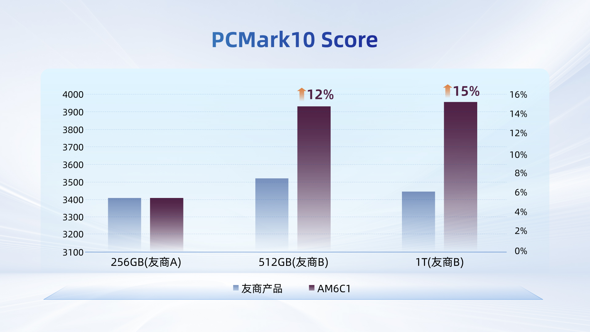 在PCMark 10測(cè)試中,AM6C1的512GB與1TB版本得分均突破3900,較友商B同類產(chǎn)品領(lǐng)先10%以上;其256GB版本的表現(xiàn)亦與友商A的同級(jí)產(chǎn)品相當(dāng)。